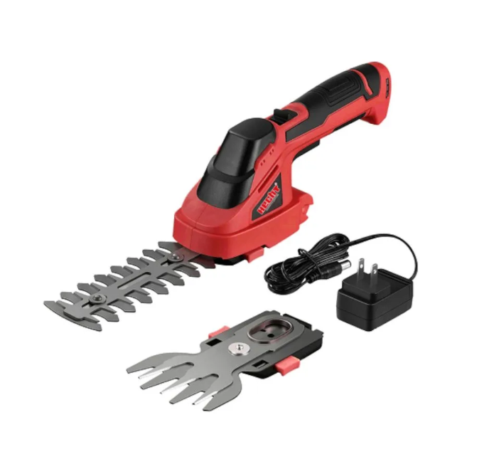 Foarfecă cu acumulator, pentru tuns iarba și ajustări mai mici la tufe și garduri vii. Rezistă până la 40 de minute cu o singură încărcare. Timpul de încărcare este de aprox. 4 h. Alimentarea se face cu o baterie, integrată, cu litiu de 3,6 V / 1,3 Ah. Sunt livrate cu două lame interschimbabile cu lățimea de 7,5 și 11 cm.