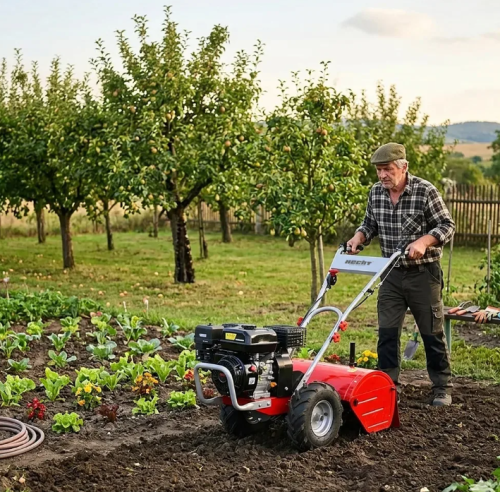 HECHT 750 este un cultivator pe benzină performant, echipat cu un motor RATO OHV fiabil, în 4 timpi, cu o cilindree de 212 cm³. Datorită lățimii de lucru de 50 cm și a cuțitelor de cultivare cu diametrul de 34 cm, este ideal pentru prelucrarea eficientă a solului în grădini, paturi de flori și câmpuri mai mici.