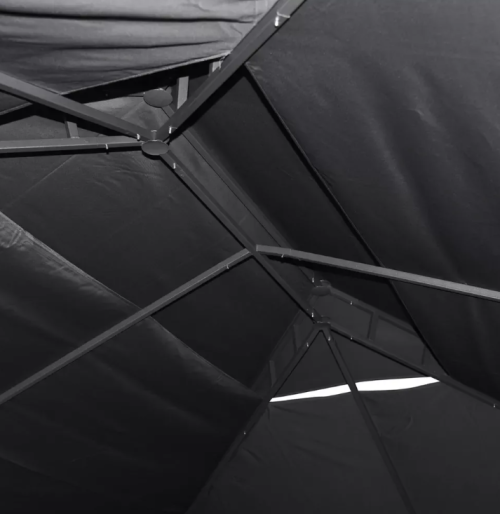 Construcția robustă poate fi asamblată și dezasamblată foarte ușor. Cu toate acestea, este foarte stabilă. Acoperișul este acoperit cu poliester de 180 g cu acoperire PA. Pereții laterali retractabili sunt realizați din poliester de 160 g.