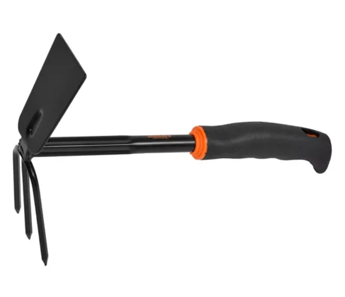 Sapa mică de mână, cu două fețe, combinată cu un cultivator cu trei dinți. Material oțel, mâner din plastic antiderapant.