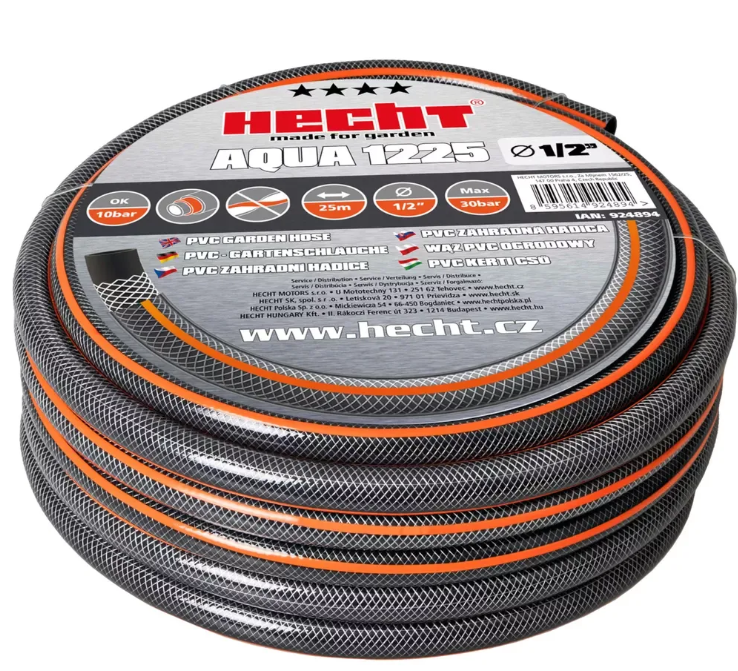 HECHT AQUA este un furtun din PVC durabil în trei straturi, fabricat dintr-o combinație de PVC înmuiat și împletitură de presiune din fibre sintetice. Stratul negru interior previne formarea algelor și oferă protecție UV. Stratul intermediar din fibre sintetice conferă furtunului o rezistență ridicată la presiune. Stratul exterior neted conferă o rezistență ridicată la abraziune, iar furtunul alunecă mai bine pe sol. Furtunul este foarte stabil din punct de vedere dimensional. Presiunea maximă este de până la 30 bar, presiunea normală de funcționare este de 10 bar. Diametrul furtunului este de 1/2". Lungimea furtunului este de 25 m. Datorită proprietăților sale, furtunul este potrivit pentru udarea din sistemul normal de alimentare cu apă, dar și pentru conectarea pompelor, a instalațiilor de apă și a altor accesorii