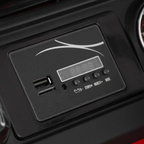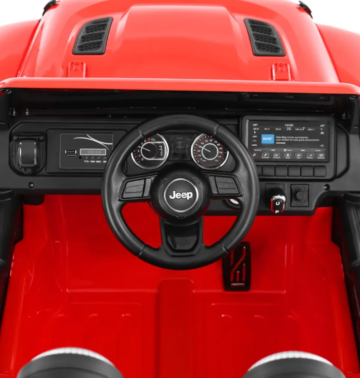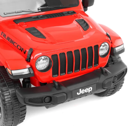 Jeep Wrangler Rubicon fără fir în rosu. Potrivit pentru copii cu vârsta cuprinsă între 3 - 8 ani. Sarcină maximă 35 kg. Baterie 12 V, 10 Ah / 12 V, 2 x 35 W. 2 motoare, efecte sonore și luminoase, MP3, USB, SD. Licență originală Jeep Wrangler Rubicon.